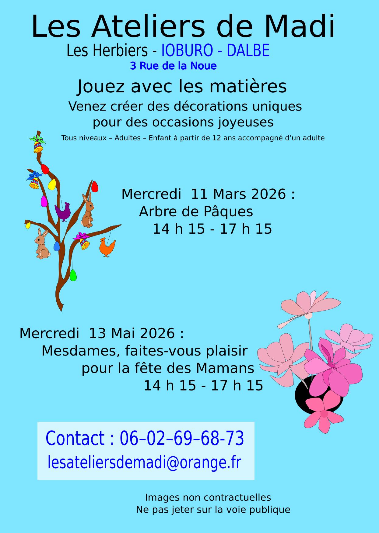 Contact : 06 02 69 68 73 ou lesateliersdemadi@orange.fr