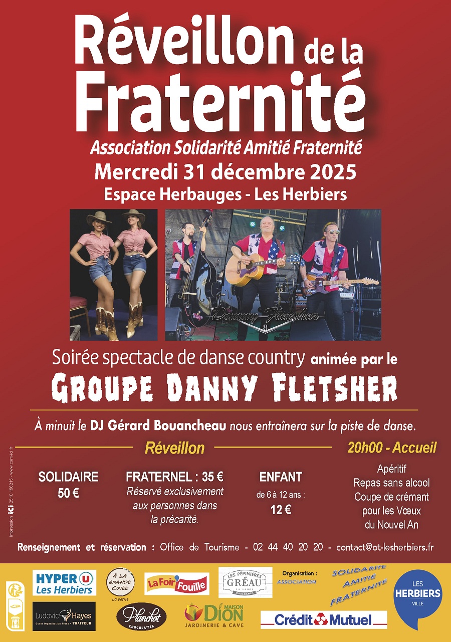 Réveillon de la Fraternité à 20h, à l'espace Herbauges des Herbiers, par l'association Solidarité Amitié Fraternité. Soirée animée par Le Groupe Danny Fletsher puis par le DJ Gérard Bouancheau à partir de minuit.